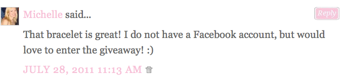 Congrats to Michelle for winning the bracelet. (Time to get a FB account, Michelle, so I can stalk you there. :))